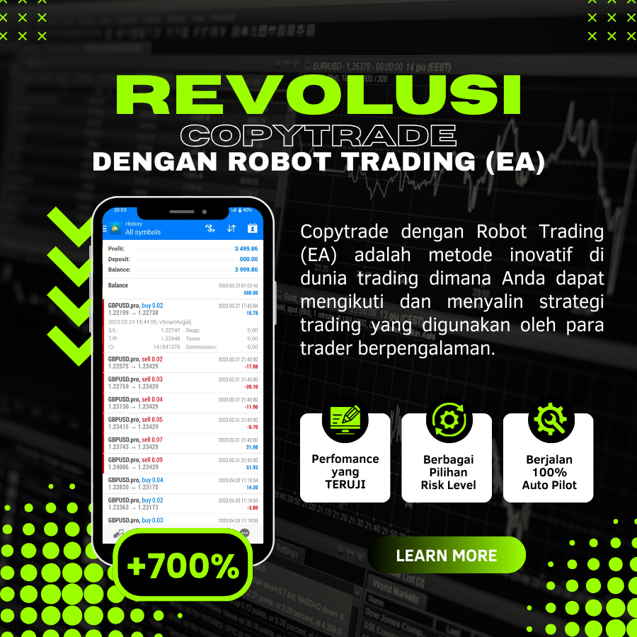 Robot Trading bekerja tanpa lelah 24/7. Anda tidak perlu terjaga semalaman atau khawatir ketinggalan peluang perdagangan. Semua eksekusi dilakukan secara otomatis dan instan.